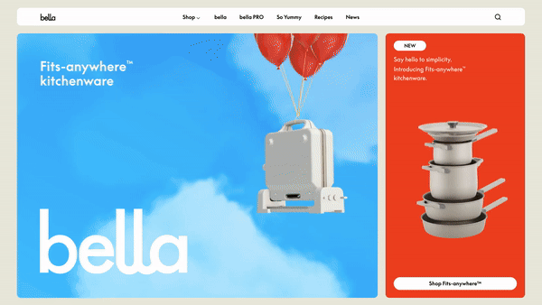 The most captivating animation features a griddle suspended in mid-air, supported by floating balloons. As users scroll, the griddle is released, floating down and landing smoothly on a kitchen countertop with other Bella products. This animation illustrates the product’s functionality in a dynamic and engaging way.